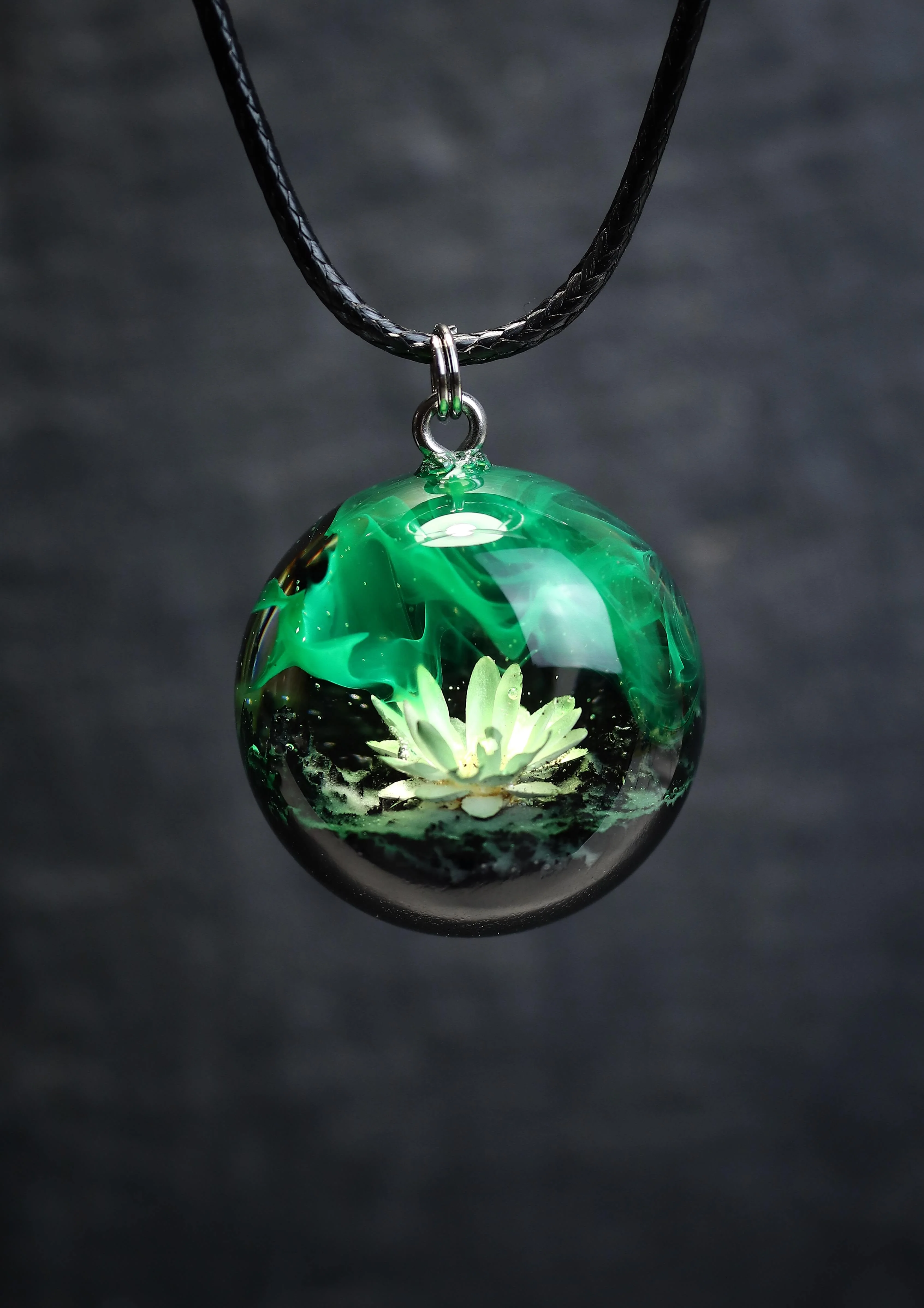 Handmade round pendant from black hornbeam wood and epoxy resin with white glixia inside.