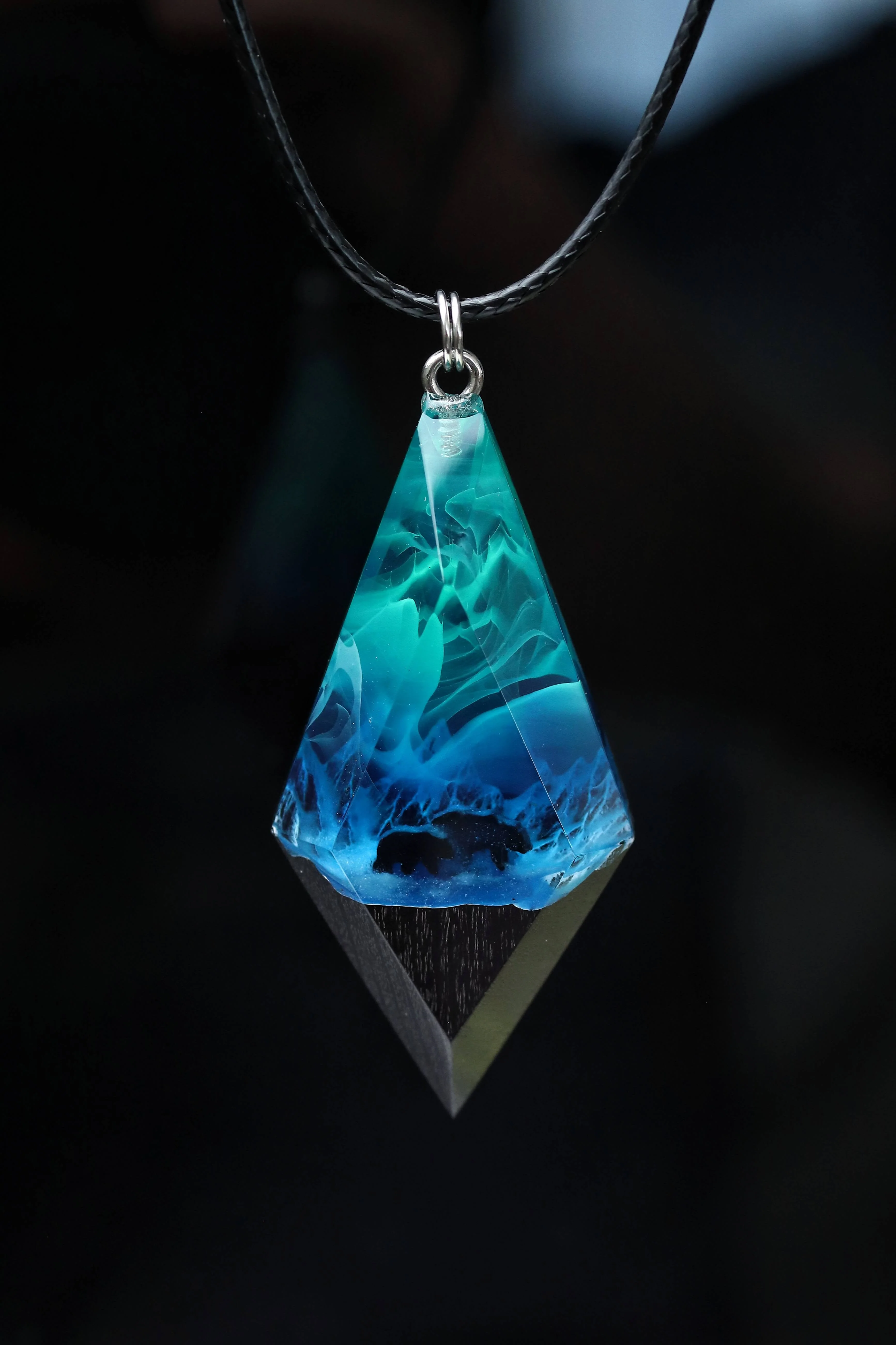 Handmade pendant from black hornbeam wood and epoxy resin with snow mountains and bears inside.